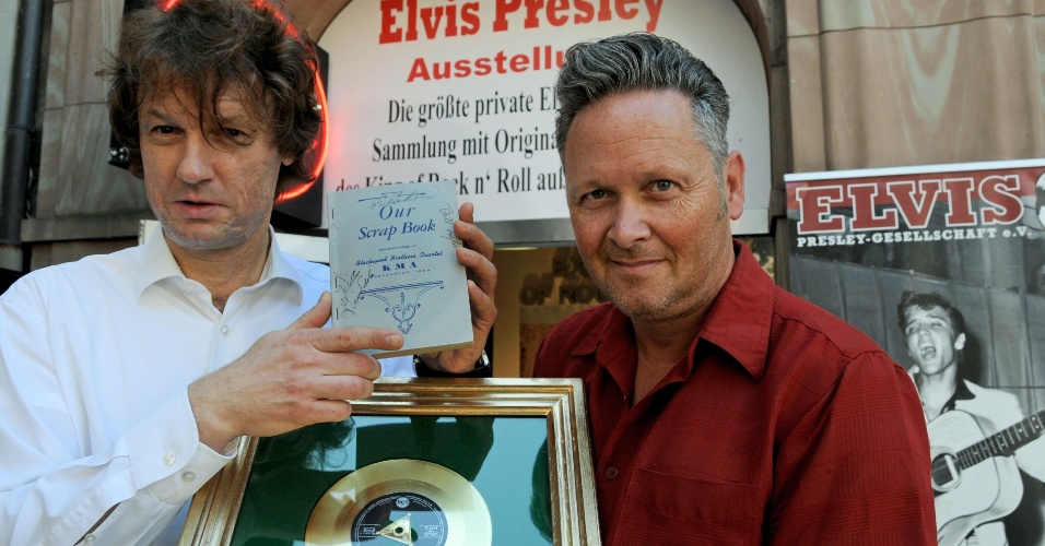 Os colecionadores alemães Torsten Meck (à esquerda) e Andreas Schröer exibem as última aquisições para o Museu Elvis Presley: um livro de músicas e um disco de ouro pela música "Hound Dog". Localizado em Dusseldorf, na parte oeste da Alemanha, o local reúne a maior coleção de artigos do cantor fora dos Estados Unidos (15/8/12)